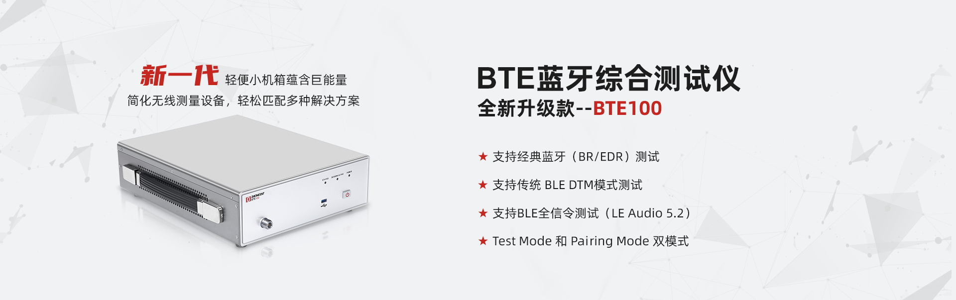BTE100+是由中承科技獨立自主研發的新一代藍牙射頻協議綜測儀,支持藍牙設備配對信令模式下的功率、頻偏、調制、接收靈敏度、吞吐量等射頻指標精準測試,支持多種藍牙協議版本的深度解析及實時IQ數據捕獲。